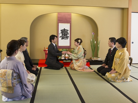 千草ホテルではホテルの女将が、おごそかな雰囲気のなか、幾多の約束事を基にご両家の慶事を寿ぎます。
