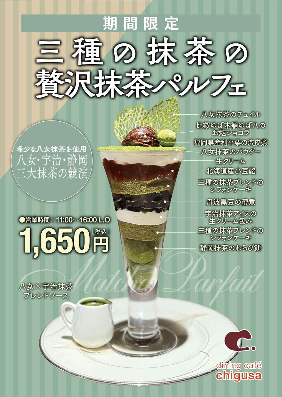 日本を代表する八女・宇治・静岡の個性豊かな抹茶を贅沢に使用した抹茶パルフェを期間限定にて1,500円(税込1,650円)で10月3日より提供を始めます。
