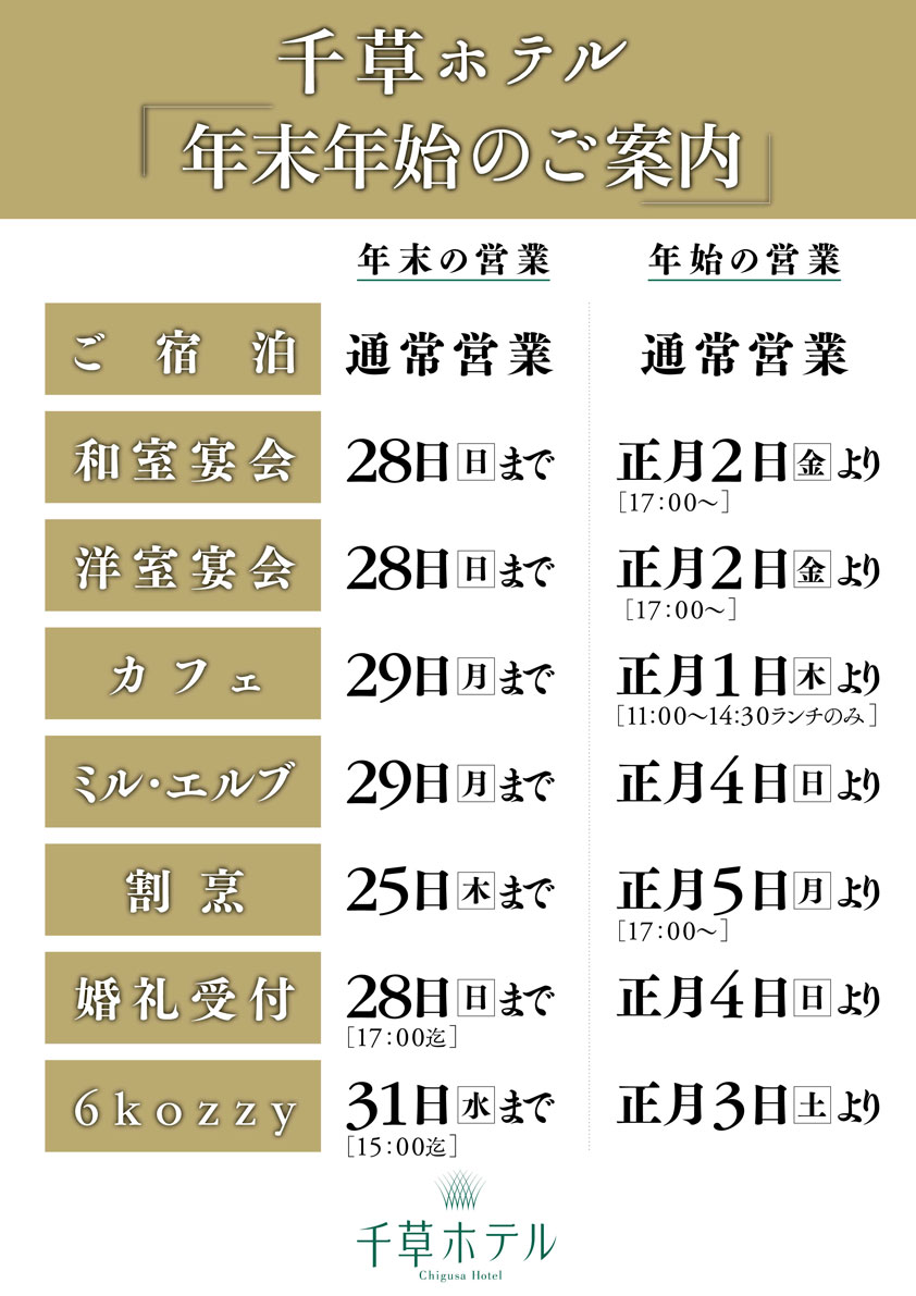 年末年始 営業のお知らせ 2025.12.22 【千草ホテル年末年始 営業のお知らせ】 年末年始の営業に関して下記の通りご案内申し上げます。 テーマ お知らせメディア掲載季刊誌 最新の記事 年末年始 営業のお知らせ [ドレスノッツエ NEWS]1月の成人式振袖展示会のお知らせ レキピオvol.45冬号 夢のクリスマスケーキコンテスト2025 全作品公開!Vol.3 夢のクリスマスケーキコンテスト2025 全作品公開!Vol.2 夢のクリスマスケーキコンテスト2025 全作品公開!Vol.1 アーカイブ 2025年 (23) 2024年 (22) 2023年 (22) 2022年 (19) 2021年 (16) 2020年 (21) 2019年 (12) 2018年 (33) 2017年 (21) 2016年 (53) 2015年 (9) 2014年 (10) 2013年 (26) 2012年 (34) 2011年 (31) 2010年 (2)